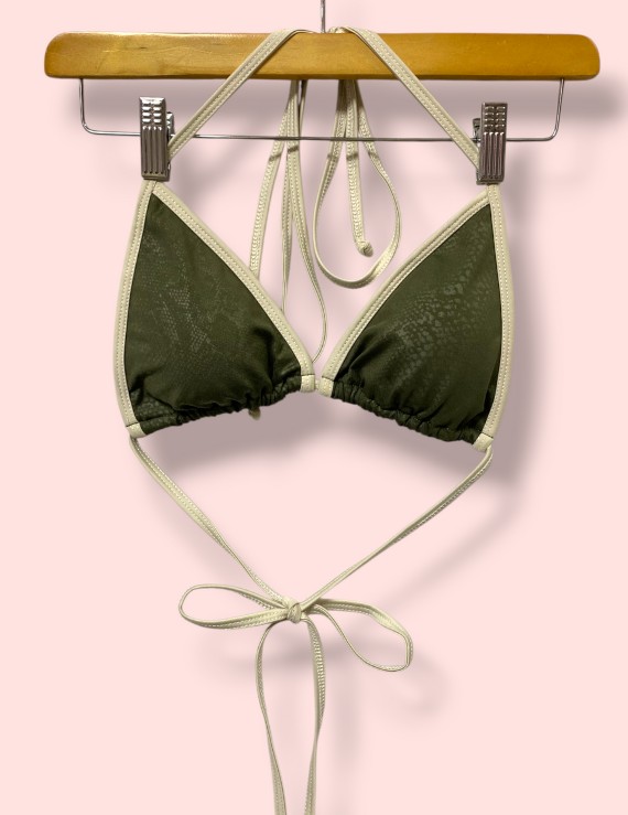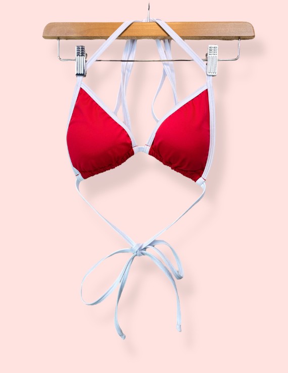 Hana Top Triangular con vivos en colores complementarios y diferentes maneras de utilizarlo, combinarlo y sobre todo excelente para broncearte con tirantes ajustables, tiras de anudar en cada hombro y en la espalda. Copas removibles